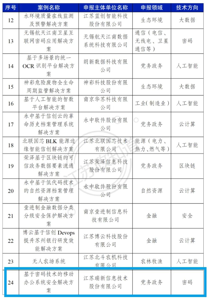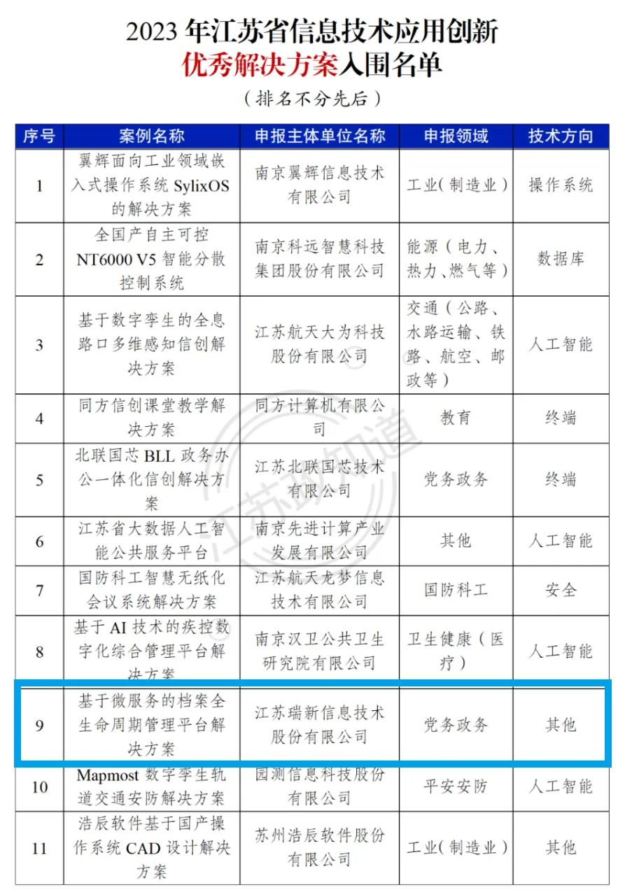 ? 根據(jù)省工信廳、省委網信辦、省黨信辦《關于開展2023年江蘇省信息技術應用創(chuàng)新優(yōu)秀解決方案(應用示范案例)征集工作的通知》(蘇工信軟件〔2023〕293號),經征集申報、信用審查、資格初審、文審初評、現(xiàn)場答辯、綜合評審等環(huán)節(jié),遴選出60個優(yōu)秀解決方案 27個優(yōu)秀應用示范案例。我司江蘇瑞新信息技術股份有限公司2項解決方案入圍2023年江蘇省信息技術應用創(chuàng)新優(yōu)秀解決方案。
