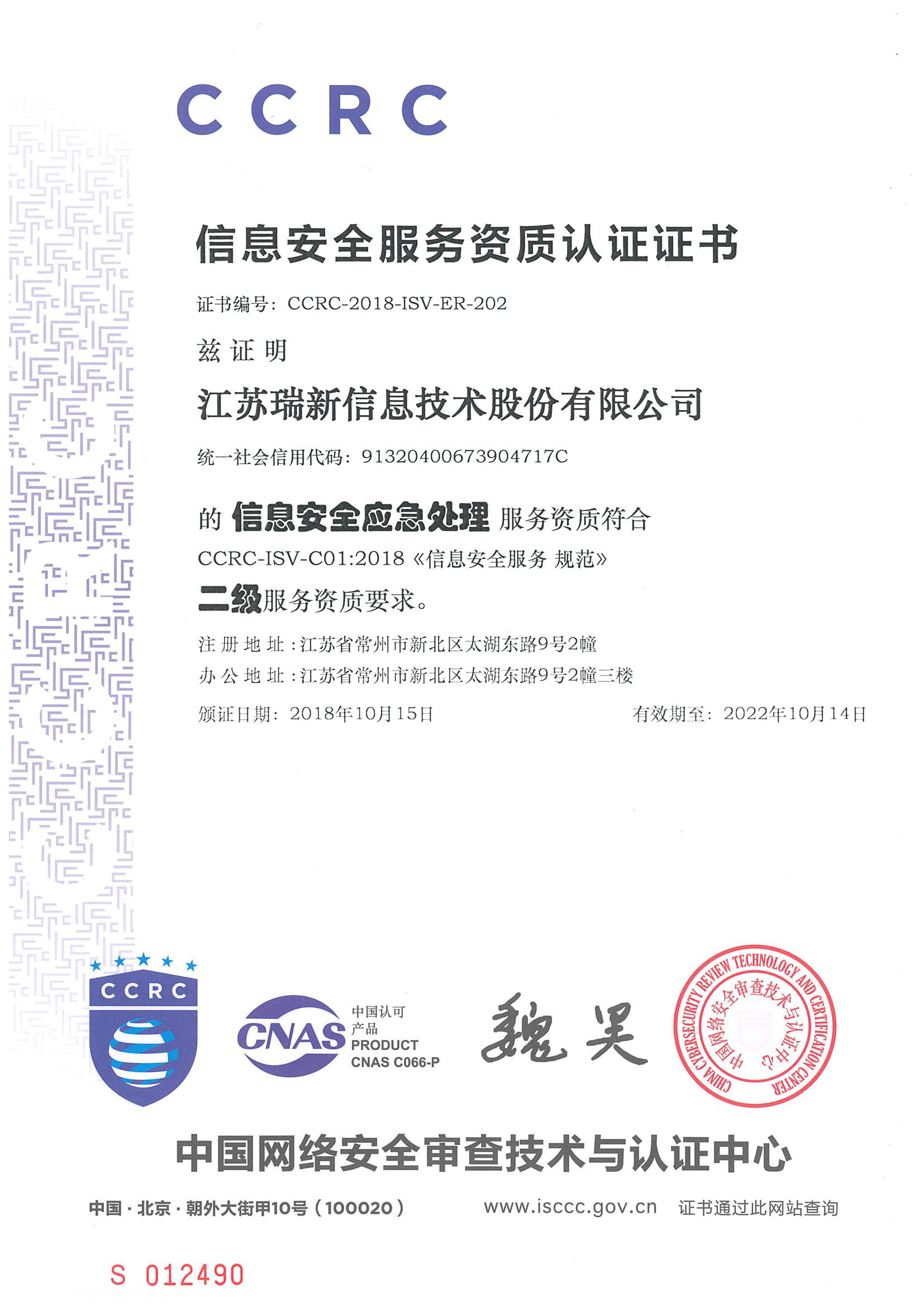 江蘇瑞新信息技術(shù)股份有限公司,專注于網(wǎng)絡(luò)安全領(lǐng)域研究,為用戶提供網(wǎng)絡(luò)安全服務(wù)、信創(chuàng)應(yīng)用軟件開發(fā)和系統(tǒng)集成等專業(yè)化服務(wù)。公司總部設(shè)立在江蘇省常州市創(chuàng)意產(chǎn)業(yè)園,自2008年成立以來,公司始終秉承“銳意創(chuàng)新,永不止步” 的信念,堅持“立足常州、服務(wù)江蘇,走向全國”的戰(zhàn)略目標(biāo),先后成立南京分公司、徐州分公司、淮安分公司、連云港分公司和南通分公司。公司以“平臺+服務(wù)”的創(chuàng)新模式為用戶提供7*24小時安全監(jiān)測服務(wù),主要涵蓋預(yù)警監(jiān)測、風(fēng)險評估、應(yīng)急響應(yīng)、培訓(xùn)服務(wù)、工業(yè)控制、數(shù)據(jù)評估、密碼安全等業(yè)務(wù)。客戶主要涉足黨政機(jī)關(guān)、公安、財稅、科教、質(zhì)監(jiān)、電力及大型企業(yè)用戶等。成立至今,公司榮獲全國“2020信創(chuàng)產(chǎn)業(yè)獨(dú)角獸100強(qiáng)”第50強(qiáng)、“江蘇省網(wǎng)絡(luò)安全重點(diǎn)企業(yè)”等獎項(xiàng),并擔(dān)起社會責(zé)任,創(chuàng)建網(wǎng)絡(luò)安全“紅色衛(wèi)士”宣傳隊,組織網(wǎng)絡(luò)安全宣傳公益活動,贏得了客戶和社會群眾的廣泛信賴。
