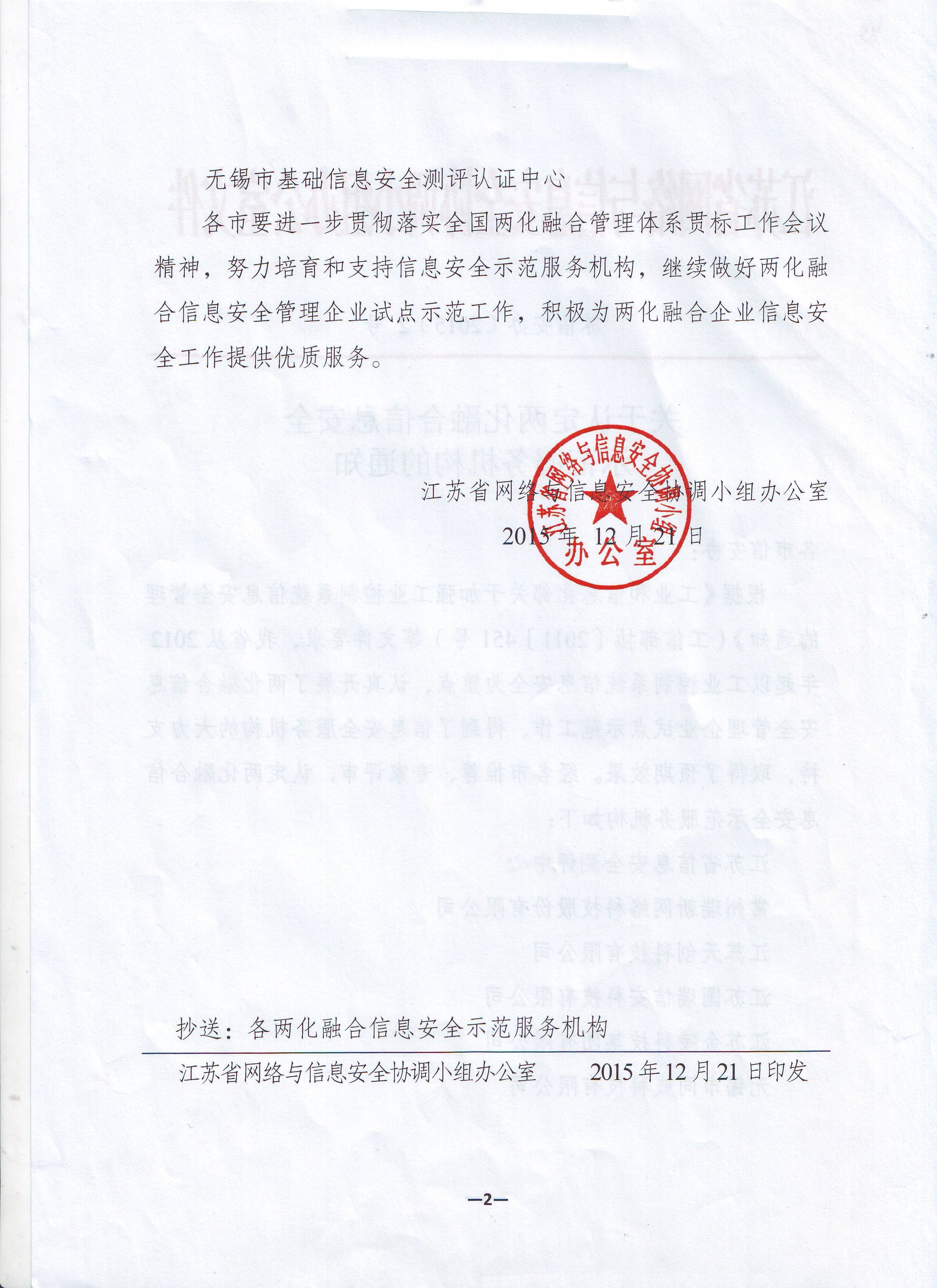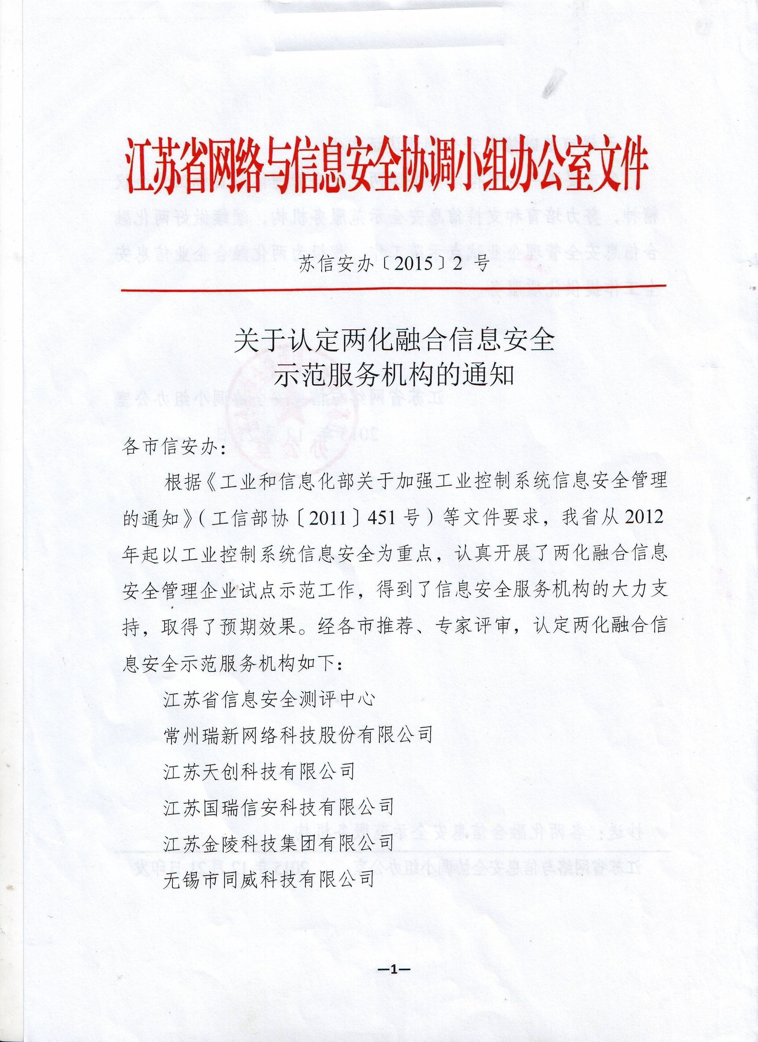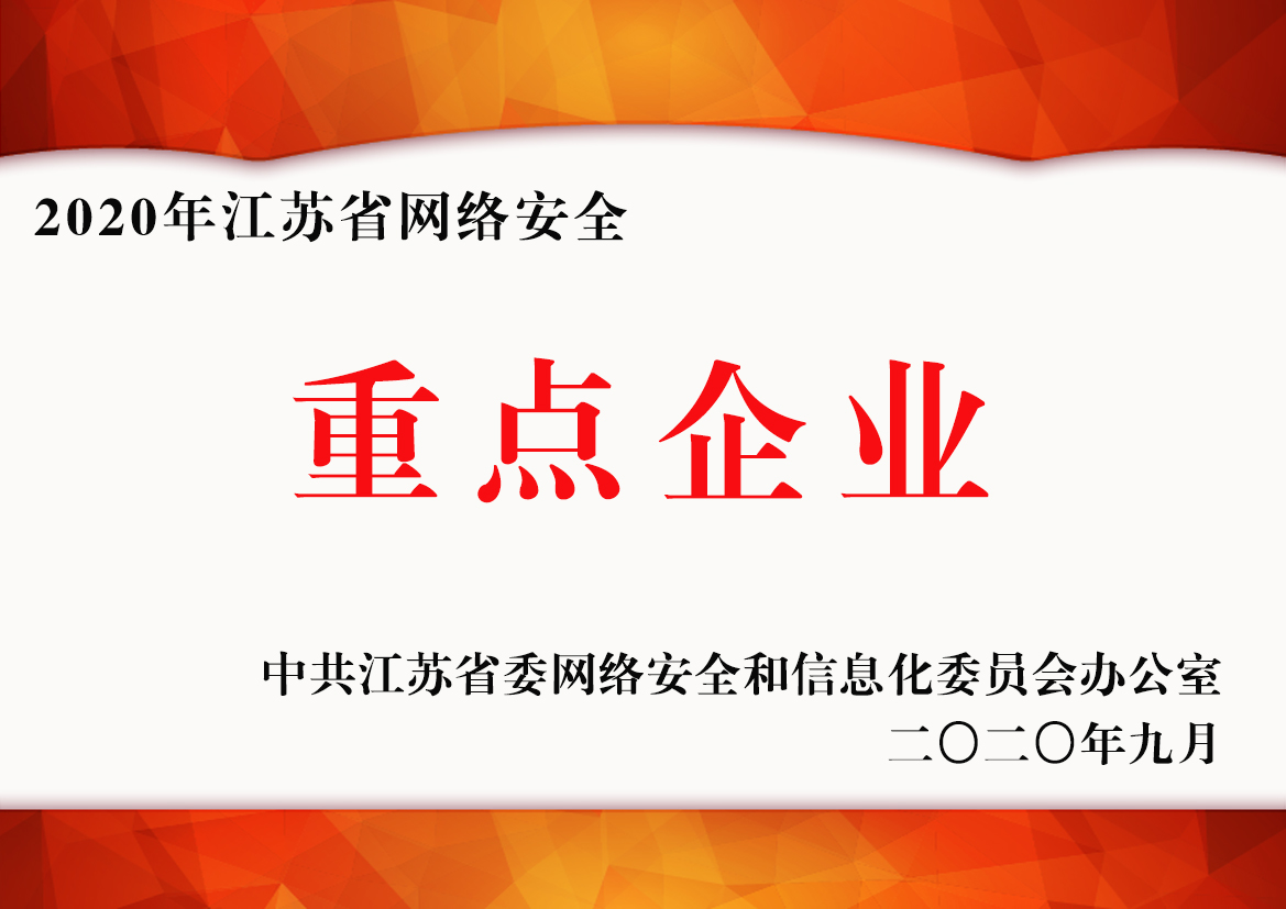 公司獲得了中國網(wǎng)絡(luò)安全審查技術(shù)與認(rèn)證中心頒發(fā)的《信息安全應(yīng)急處理》及《信息安全風(fēng)險評估》二級證書;國家信息安全測評中心頒發(fā)的《信息安全服務(wù)資質(zhì)》二級證書;江蘇省軟件行業(yè)協(xié)會頒發(fā)的《軟件企業(yè)》證書;通過了CMMI3軟件成熟度開發(fā)認(rèn)證;通過了ISO9001質(zhì)量管理體系認(rèn)證證書及27001信息安全管理體系認(rèn)證證書;是江蘇省的高新技術(shù)企業(yè)、兩化融合示范試點(diǎn)企業(yè)、信息安全應(yīng)急響應(yīng)支撐單位;是常州市十佳軟件企業(yè)。